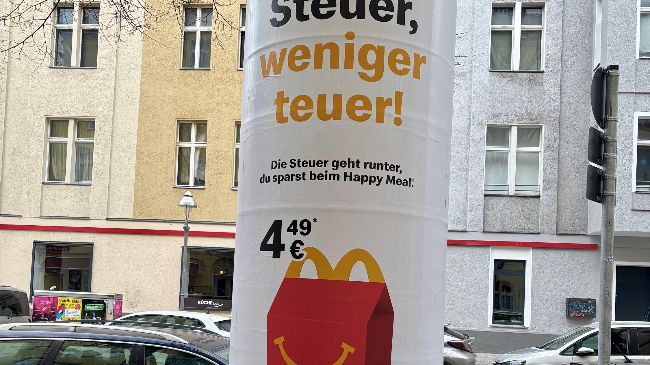 «Weniger Steuer, weniger teuer» [«Une taxe [sur la valeur ajoutée] moins élevée, des produits moins chers», NDLR]. Dans les rues et les journaux allemands, le géant du fast-food McDonald’s s’est offert une grande campagne de publicité célébrant le passage du taux de TVA dans la restauration de 19% à 7%. Depuis l’entrée en vigueur de cette mesure, le 1er janvier, l’entreprise a «sensiblement réduit les prix de vente conseillés de cinq menus très populaires», parmi lesquels le menu pour enfants Happy Meal. Et précise qu’elle souhaite ainsi «soulager en particulier les familles et les clients disposant d’un budget plus modeste».